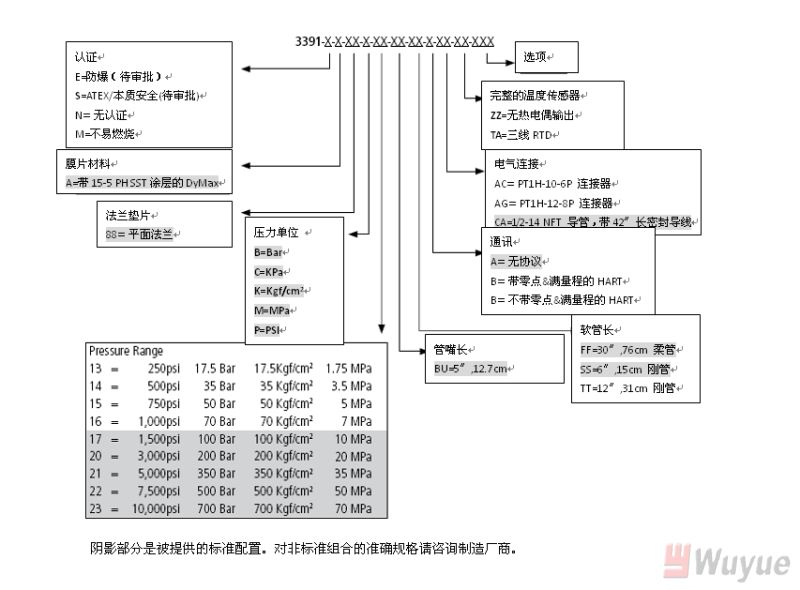 輸出,模擬:4-20mA(標準壓力,溫度可選) 輸出,數字:HART 綜合精度(錯誤)(20-100%滿量程): ±0.15%滿量程(3M和3M以上) +0.25%滿量程(1.5M和1.5以下) 溫度漂移(77-572℉,25-300℃):0.001%滿量程/℉,最大(0.001%滿量程/℃,最大) 重復性:±0.1%滿量程 爆破額定壓力:2X滿量程 超壓 額定:1.5X滿量程 量程:1,500至10,000psi 可調范圍:6:1調節比,向下 負載電阻:250歐姆@18Vdc;500歐姆@23Vdc |